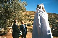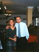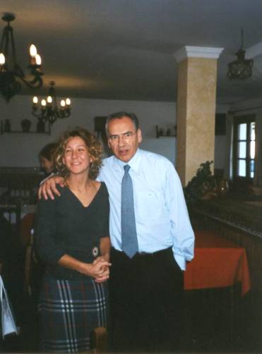 La escultora Elisa Ramos y Alfonso Guerra. Elisa Ramos, Alfonso Guerra y personal del Mesón de los Naranjos en Melegís.