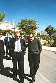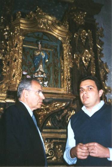 Alfonso Guerra en la Puerta de la Iglesia San Juan Evangelista de Melegís. Alfonso Guerra con el arquitecto José Manuel López Zarco.