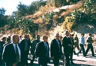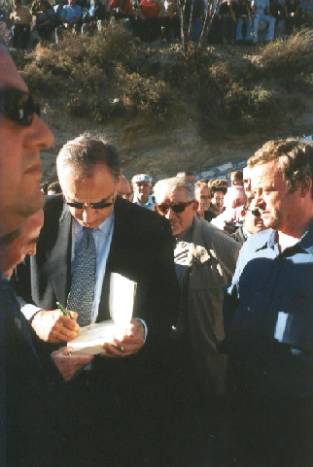 Alfonso Guerra y su acompañamiento caminando hacia el Puente de Los Hijones. Alfonso Guerra firmando la dedicatoria de un libro.