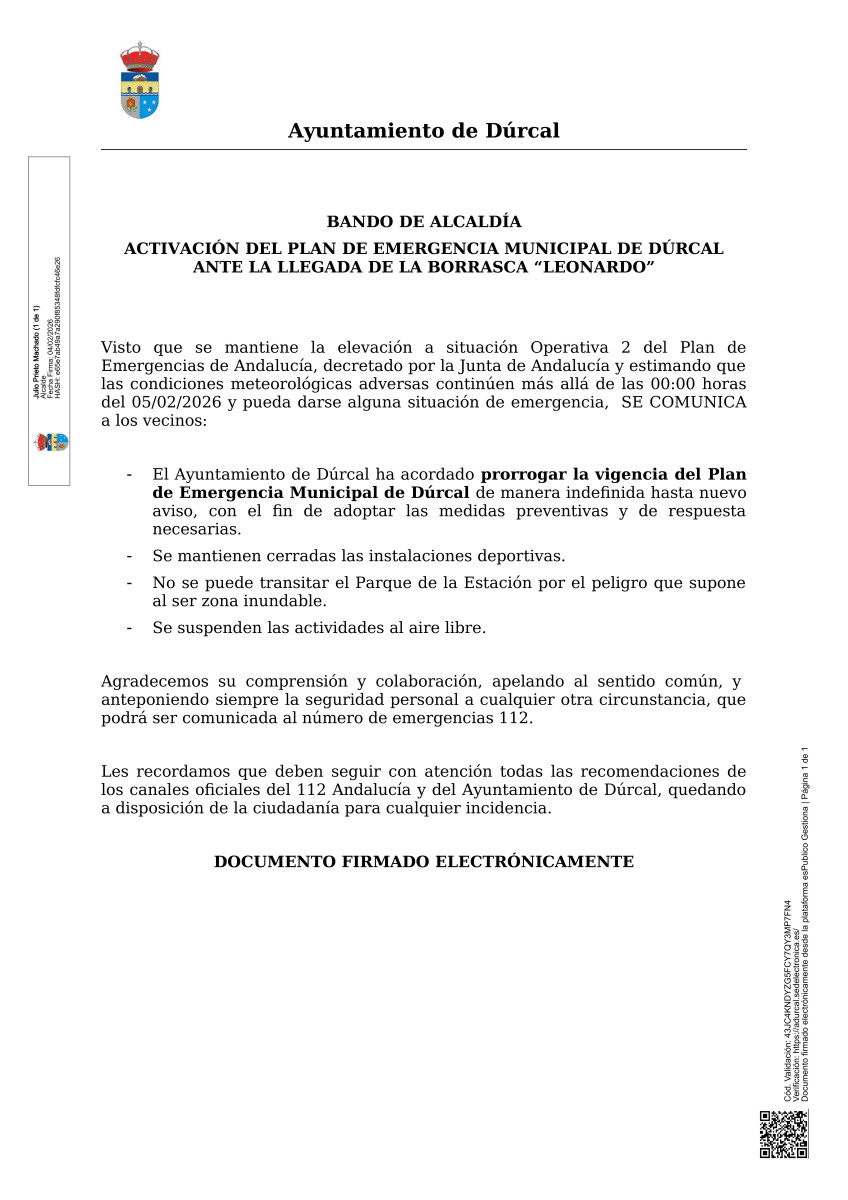 ACTIVACIÓN DEL PLAN DE EMERGENCIA MUNICIPAL DE DÚRCAL ANTE LA LLEGADA DE LA BORRASCA “LEONARDO”